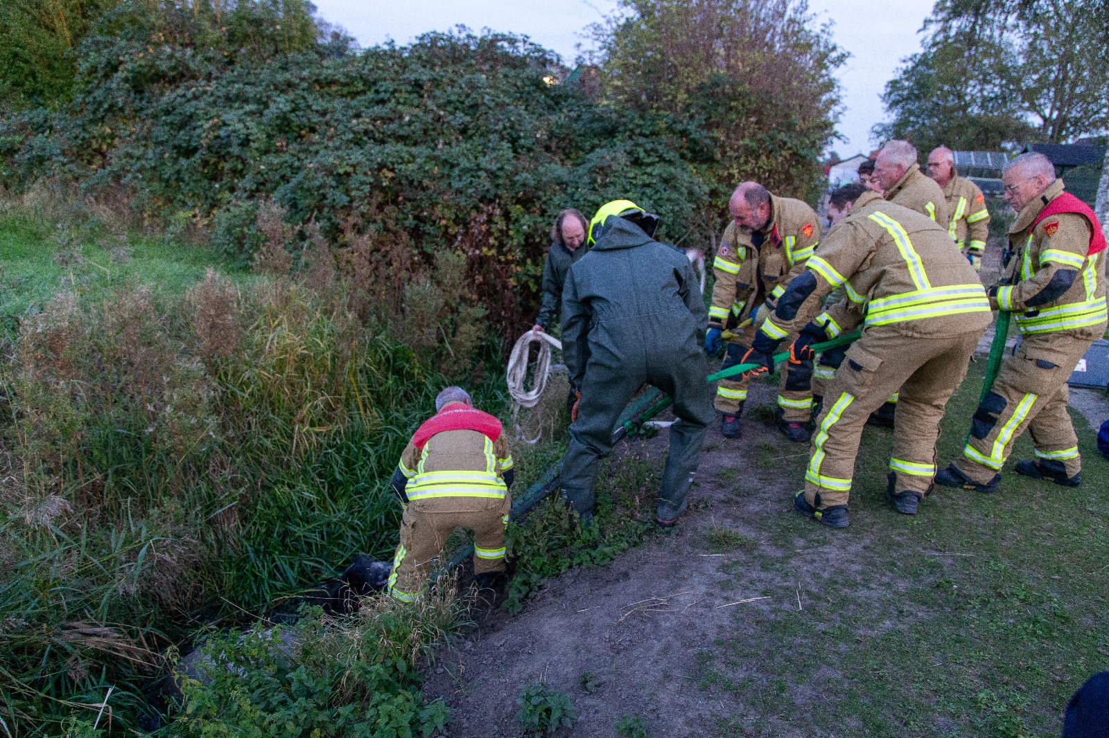 De brandweer vroeg assistentie van het korps uit Oudenhoorn, dat speciaal is uitgerust om vee uit het water te redden. Kort na hun aankomst wist men het dier snel en veilig op het droge te krijgen.